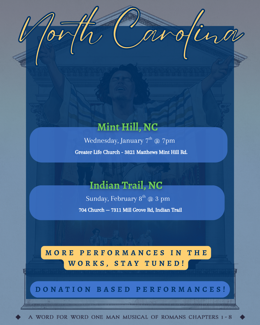 A one-man dramatic recitation of Romans 1-8, performed by Isaiah Ziersch, complete with music and song. Created to encourage the church and spark movement within the Kingdom of God.